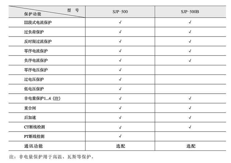SJP-500系列保護適用于線路保護,電容出線保護,廠用變保護和線路保護。針對被保護設備及保護要求的不同,SJP- 500系列保護的型號和功能配置如下: