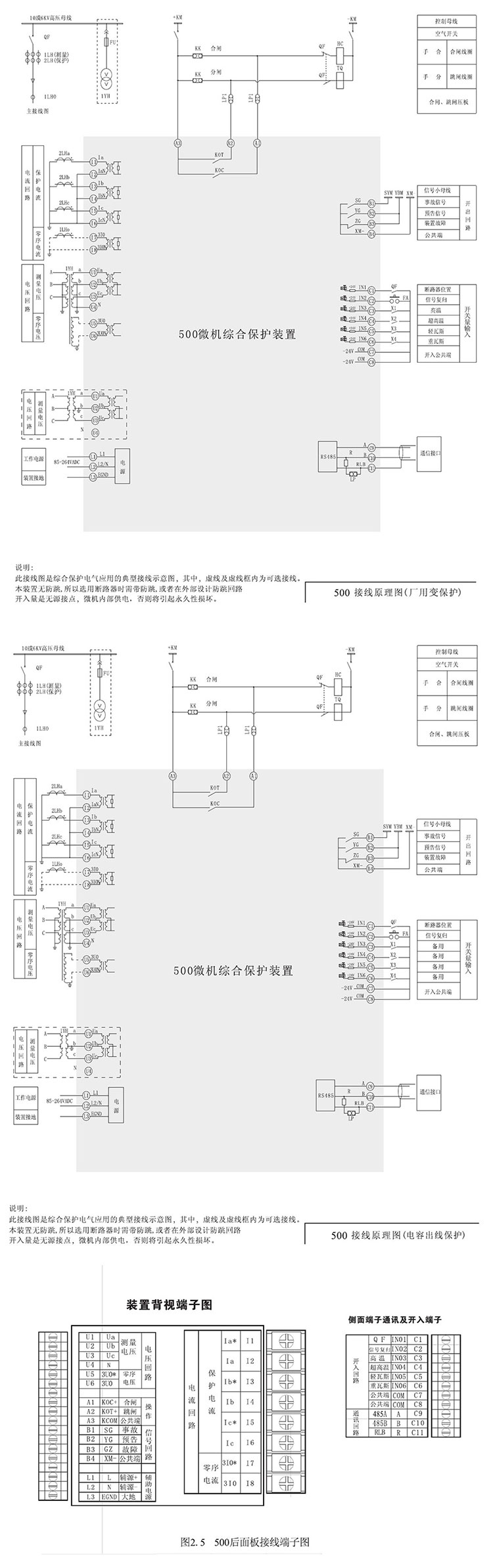 U1-U6端子為電壓回路端子,其中U1-U4為測量電壓輸入,如V/V接線方式,U4端子可以懸空。U5 U6端子為零序電壓輸入端子。
